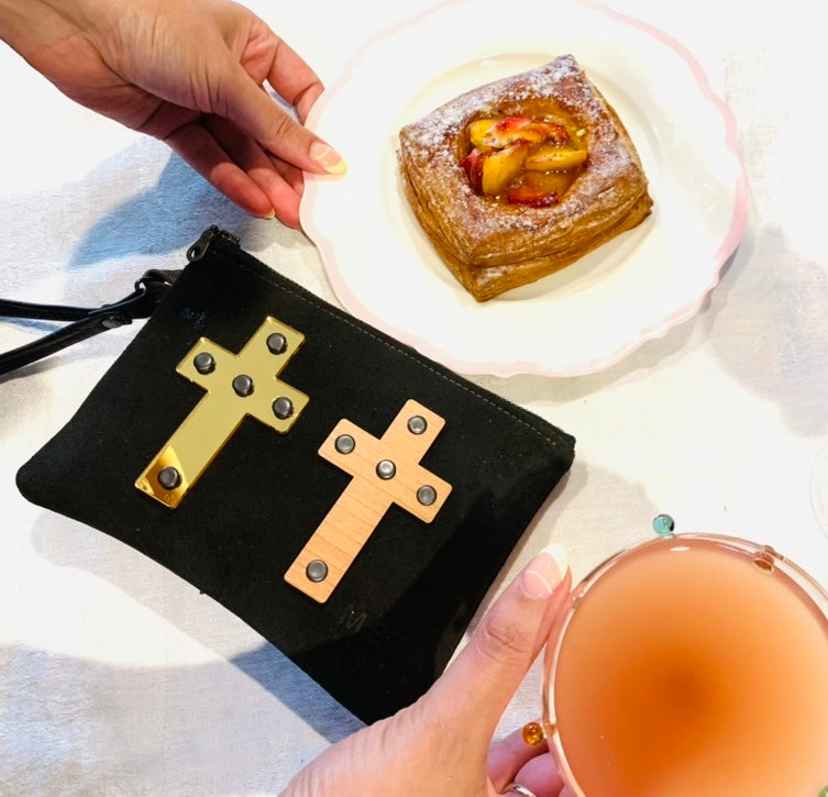 Iconic style from on our Cross clutch. Strong on symbolism and style with riveted acrylic and timber forms on upcycled leather, this is an edgy and effortless look.