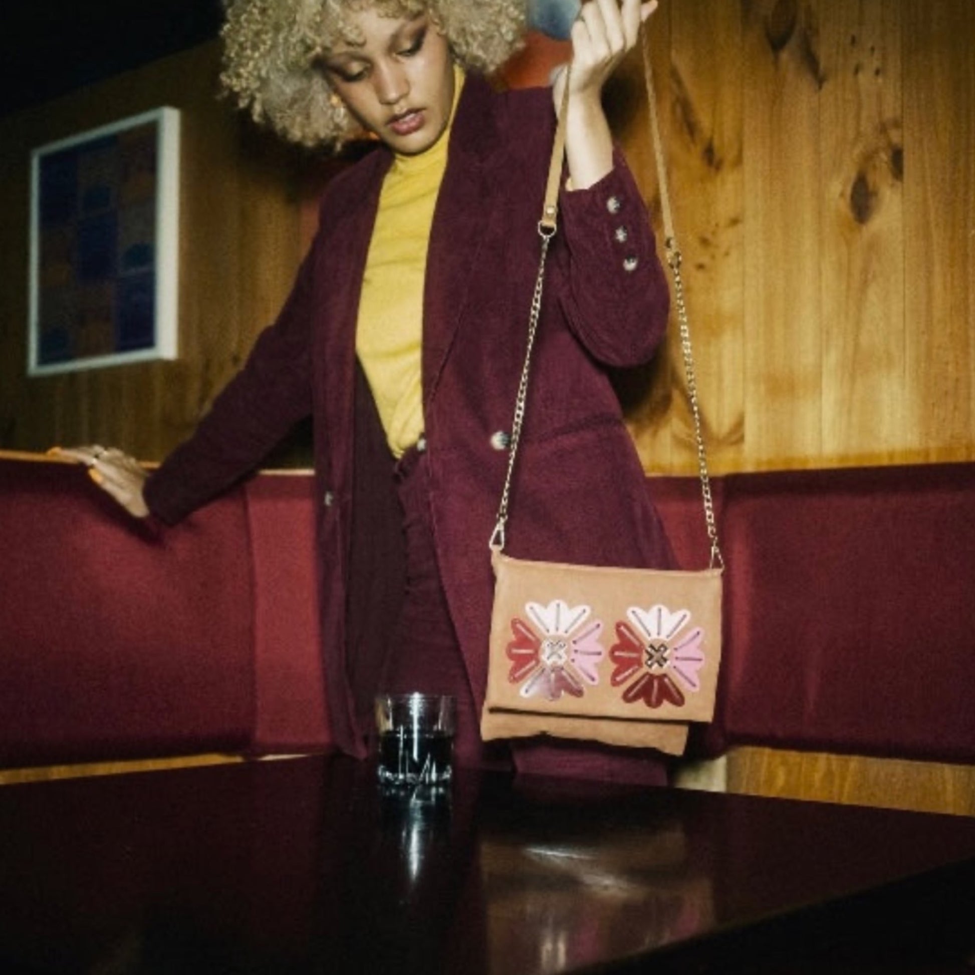 The Flower Bag incites textural and visual interest, with acrylic and timber forms patterned into a floral motif, secured with woven leather through each piece. Inspired by a crocheted heirloom, lined with up-cycled striped cotton, this handmade bag is subtle elegance....and one-of-a-kind.